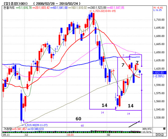 그는 이러한 투자자의 심리가 차트에도 잘 나타난다고 하면서 “1520과 1720 사이 박스권 조정이 5개월 동안 지속되는 과정에서 전체 200포인트 등락의 중심에 와 있다”라는 상기시키면서 “전체 14일 하락과 반등과 숨고르기 14일의 대칭점이자 가격의 대칭점인 1620에 와 있다”라고 말했다.