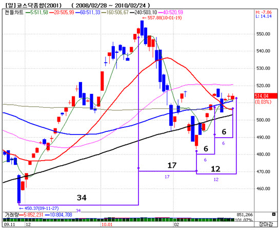 코스닥 차트에 대해서도 “상승 34일의 1/2인 17일은 탄생파동의 조건이며,재차 상승과 조정의 숨고르기가 끝난 상황이 20일선 안착이다”라면서 강한 상승이 시작된다면 하락추세를 이기는 본격적인 상승장이라고 해석했다.