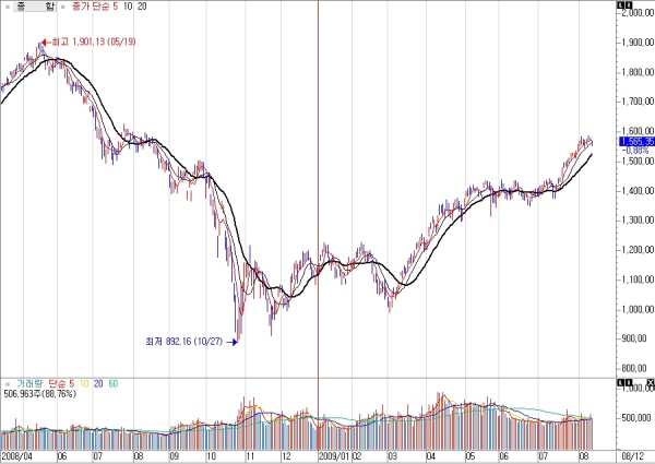 간단하지만 매우 효과적인 방법으로 종합지수의 이동평균선을 살펴보는 것입니다. 이동평균선에서 골든크로스가 발생되면 매매에 나서고 데드크로가 나오면 매매를 멈추는 것이죠.