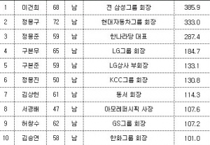 KCC 정몽진 회장은 130억8000만원으로 6위를 차지했고 코스닥 상장사인 동서 김상헌 회장이 114억3000만원으로 7위에 올라 눈길을 끌었다.