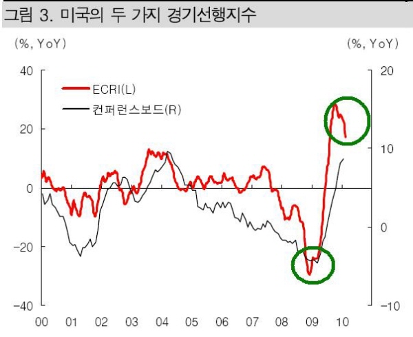 먼저, 미국의 경기선행지수는 두 가지가 있다. 하나는 컨퍼런스보드의 선행지표이고, 다른 하나는 ECRI 선행지수다.두 가지 가운데 ECRI 선행지표가 좀 더 빠른 편이고 선행지수의 선행지수 역할을 한다고 보면 된다.