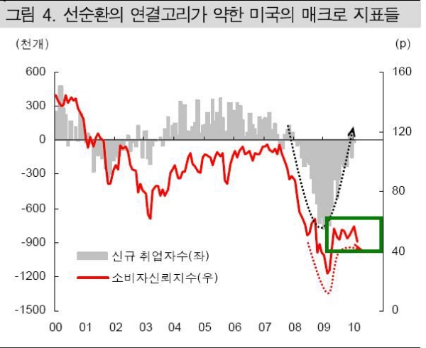 국내적으로도 경기선행지수의 peak out이 우려되고 있다. 이런 상황에서 한미간 경기 회복의 시차가 국내경기선행지수의 peak out 충격을 흡수해줄 것으로 기대하는 분위기인데 경기선행지수로 보자면 미국 쪽 사정도우리와 크게 다르지 않은 것으로 나타난다. 앞으로 경기선행지수의 움직임은 국내외 모두 주시해야 한다는 의미다.