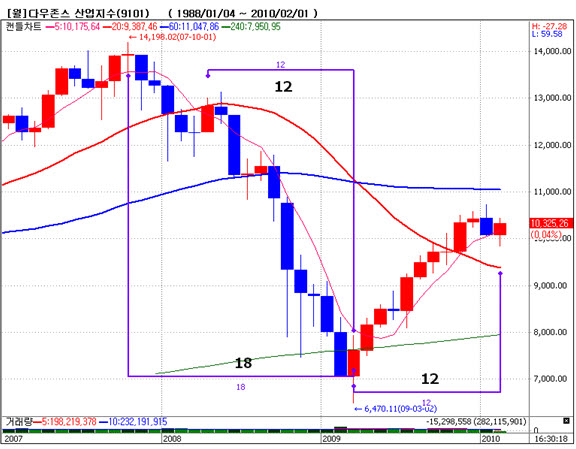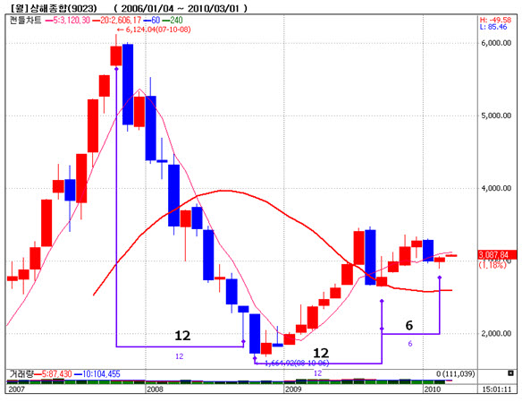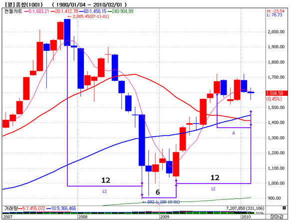 한국 거래소차트를 본다면, "한국증시는 6개월 조정을 보이고 반등했으며, 7개월 상승과 5개월 조정을 보이고 있다"라면서, 중국증시가 반등의 선도역할을 하면서 한국증시도 상승세로 전환될 것이라는 견해를 밝혔다.
