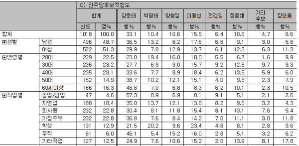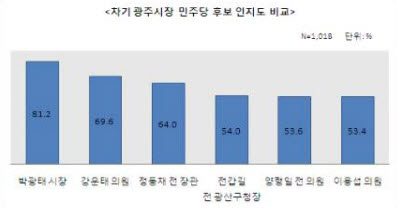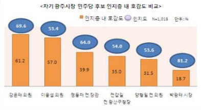 조사에 따르면, 각 후보의 인지층 내 호감도는 강운태 의원(61.2%)이 가장 높았으며 이용섭 의원(57.0%)이 역시 50% 이상으로 뒤를 이었고 정동채 전 장관(39.9%), 전갑길 전 광산구청장(35.0%), 양형일 전 의원(31.5%)은 30%대의 호감도를 보였다. 현 박광태 시장은 18%대의 호감도를 보이면서 최저수준을 기록했다.