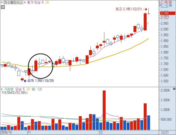 골든크로스 이후 20일선 위에서 물량을 소화하는 종목을 발굴하면 어떻게 해야 하지요? 아시죠. 당연히 공략을 해야죠. 주가가 20일선을 벋어나 상향으로 움직이면 매수에 가담을 하는 것입니다. 간단하죠. 그런데 수익은 얼마인가요? 그것은 아무도 모릅니다. 가는 데까지 가는 것이죠.
