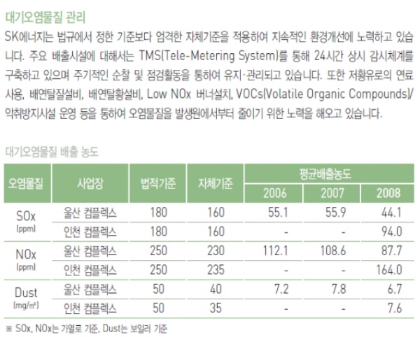 | SK에너지 2008년 지속가능성 보고서. 대기오염 관리를 위해 저황유로의 연료를 사용, 지속적인 노력을 하고 있음을 밝히고 있다. |