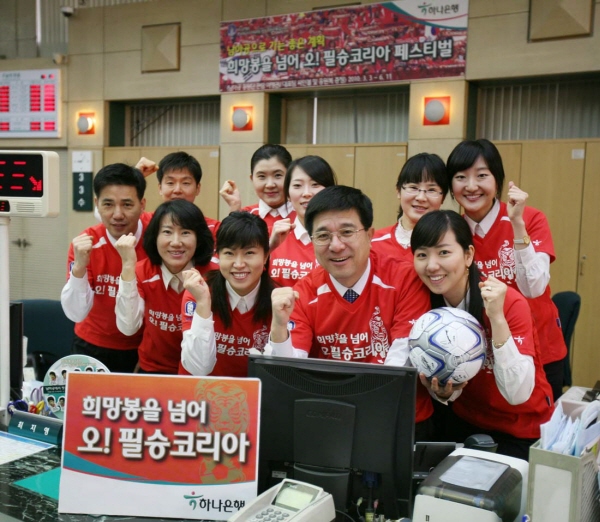 한국축구국가대표팀 후원은행이기도 한 하나은행은 오는 6월까지 ‘희망봉을 넘어~오!필승코리아!’ 캠페인을 펼친다. 특히 코트디부아르와의 평가전이 열리는 3일에는 영업점을 포함한 전 직원이 대표팀 응원복을 입고 근무하는 이벤트를 실시한다.