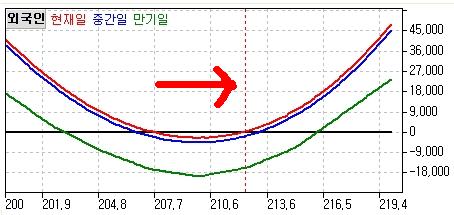 방향에 민감한 옵션차트가 오늘 프리미엄을 축소시키며 방향성 전환의 신호를 나타냈는데 어제 풋 212.5 지지선으로 지목했던 2.5가 깨지면서 마감함으로서 앞으로 방향성확대 구간에 들어갔다고 볼 수 있는 시점에 와있다.