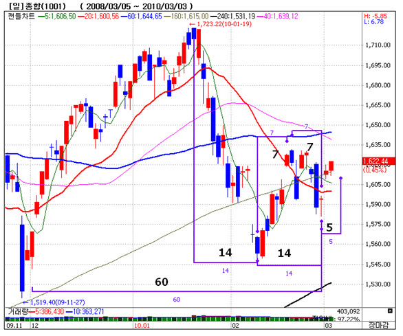 최근 형성된 탄생파동을 가리키면서 "중기고점에서 하락한 파동이 14수이며,다시 되돌림과 안착이 14수였다"라면서 "2월에 이미 바닥을 형성했으며,상승과 조정의 끝자락이 2월말과 일치하면서 3월에 새로운 상승이 시작된 것이다"라고 설명했다.