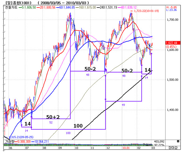 작년 5월 이후 차트를 보면서 "작년 하지를 기점으로 본다면, 14일이라는 작은 탄생파동을 보인 이후 상승세를 보였으며,상승 50(50+2)수와 조정 50(50-2)수 그리고 다시 쌍바닥 50(50-2)수를 보이는 규칙을 보였다."라면서 일정한 규칙성을 강조했으며 "다시 새로운 상승에서도 14수라는 탄생파동을 형성한다"라는 사실에 주목해야 한다”라고 말했다.