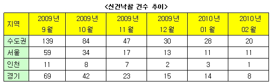 수도권아파트 신건낙찰건수는 지난 9월 139건을 최고점을 기록한 이후 금융당국의 DTI규제로 10월 84건, 11월 47건으로 급감했다. 이후 12월 30건, 1월 28건을 기록하며 감소폭이 줄어드는가 했지만 설을 전후로 주택시장이 침체되면서 지난 2월에 들어서는 20건으로 감소폭을 키웠다.