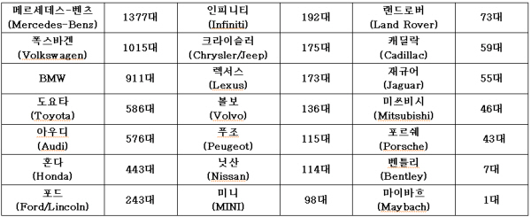 2월 신규등록대수는 지난달보다 1% 증가해 두달간 총 1만2815대가 등록됐고 베스트셀링 모델은 메르세데스-벤츠 E 300(556대), 토요타 Camry(427대), 폭스바겐 Golf 2.0 TDI(388대) 순이었다.