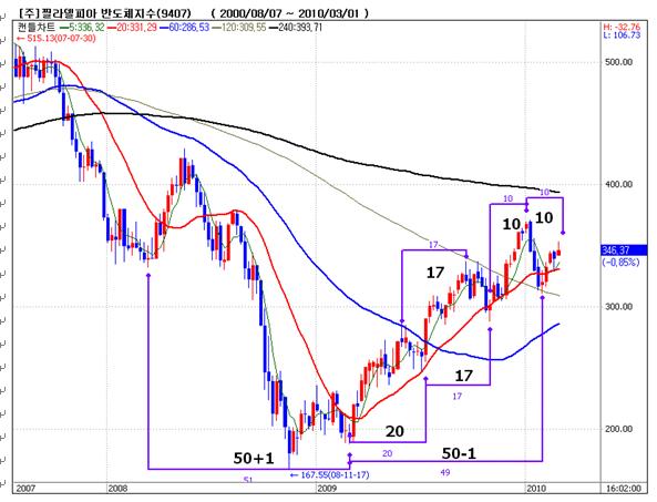 필라델피아 반도체지수를 기술적 분석으로 본다면,"쌍바닥에서 본다면, 50주가 시세의 마디로 작용되고 있다"라면서 "상승추세에서 20주 이평선 지지를 보이면서 3차 시세를 보이고 크게 조정을 받았지만,조정폭의 1/2를 회복하면서 상승 추세 복귀를 앞 두고 있다"라고 분석했다.