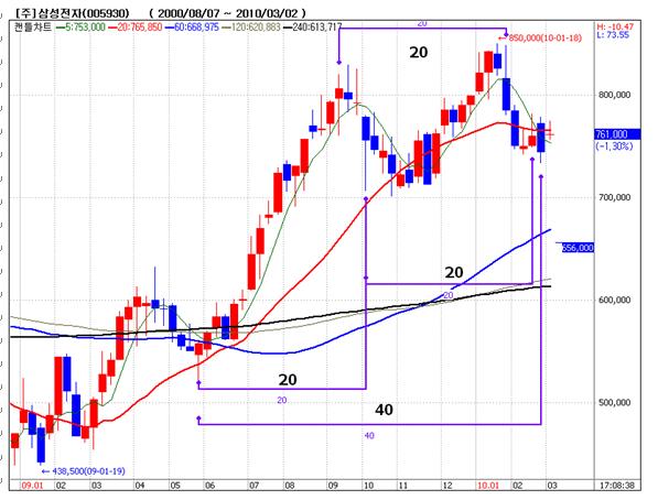 삼성전자의 주봉차트를 본다면, "본격적인 상승세를 보이는 구간에서 20주 주기운동을 보였지만,횡보 추세에서 다시 20주 주기의 쌍바닥을 보이고 재차 강세로 전환되려는 조짐을 보이고 있다"라고 언급하면서 이번 상승세가 나타나면 최소 85만원 위에서 고점이 형성되는 3봉 형태의 가능성을 시사했다.