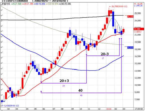 하이닉스의 주봉차트를 본다면,"불규칙 주기를 보이는 것처럼 보이지만, 3주 오차변수를 감안하면 20주 주기운동을 보인다"라면서 "지난 2009년 10월 17000원과 2010년 1월 26000원의 중심인 21600원에서 N 자형 파동을 형성하려는 양상이다"라고 분석했다.