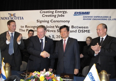<사진설명= 남상태 대우조선해양 남상태 사장(오른쪽에서 두번째)과 대럴 덱스터(Darrel Dexter) 노바 스코시아 주지사(왼쪽에서 두번째)이 악수하고 있다.> |