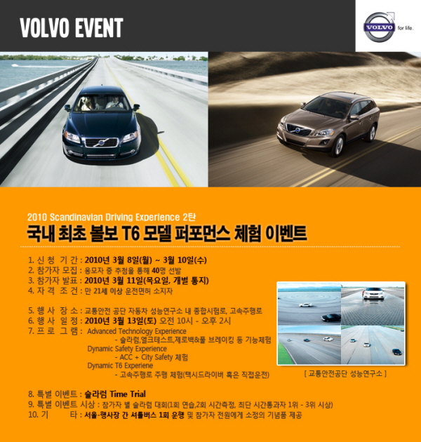 이번 이벤트는 교통안전공단 자동차성능시험연구소에서 뉴볼보 S80 T6와 뉴볼보 XC60 T6 체험 프로그램으로 순간 가속력을 확인하는 제로백 테스트와 풀 브레이킹 제동력 테스트, 슬라럼 테스트(핸들링 시험), 엘크 테스트(차체제어능력 시험) 고속주행 체험 프로그램 등이 진행될 예정이다.