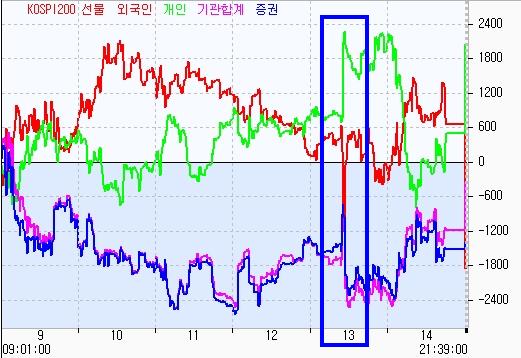 롤오버가 일어난 후 시장테스트로 선물을 이용하는 모습이 시장에서 포착되었다. 얼핏보면 개인과 기관이 같은 방향인 듯 나타났으나 이내 외국인과 기관이 같은 포지션으로 변화되는 모습을 볼 수 있다. 여기서 한 가지 더 주목해서 봐야 될 것은 장 마감 동시호가때 많은 물량의 포지션 청산이 이루었다는 점이다. 이 부분은 내일의 장을 더욱 변동성이 크게 만드는 기폭제라고 볼 수 있다.
