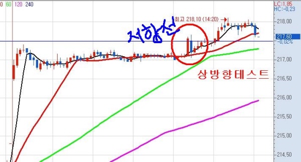 오후 1시가 넘어 출회된 약 2000계약의 롤오버이후 상승쪽에 베팅을 했던 세력이 장을 움직이려는 모습을 보였다. 하지만, 저항선인 217.5가 돌파되자 급격히 반대세력이 매도로 일관하여 지수 반등을 막는 듯 하였으나 그 힘을 끝까지 막기에는 역부족인 하루인 것 같았다.