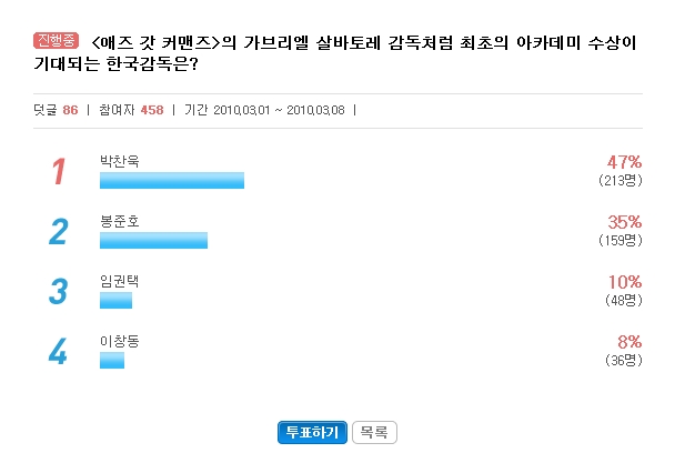 국내외적으로 자신의 역량을 펼치고 있는 박찬욱 감독은 47%의 지지를 얻어, 봉준호 감독을 제치고 이번 설문조사에서 1위에 올랐다. 이는 다수의 해외 수상경력을 보유한 그가 한국인 최초로 아카데미 수상을 기원하는 팬들의 염원이 반영된 것으로 보여진다.