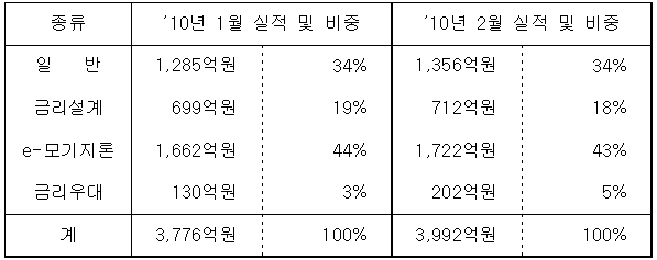 [프라임경제] 보금자리론 판매실적이 1월 대비 소폭 증가했으며 인터넷 전용상품인 ‘e-모기지론 ’이 상품별 판매비중으로 가장 높은 것으로 나타났다.