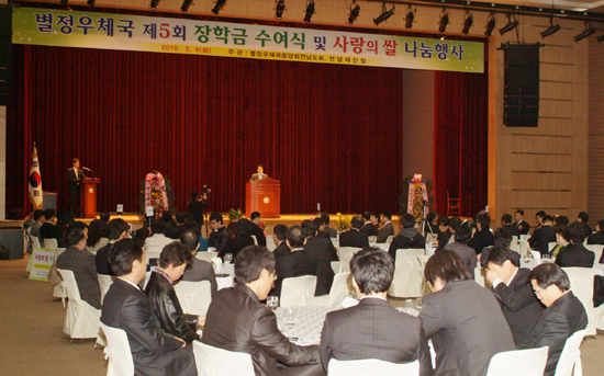 이날 총회에서는 어려운 가정환경에서도 우수한 성적으로 모범적인 학교 생활을 하고 있는 청소년 42명에게 1,350만원의 장학금을 지급하고 축하화환이나 화분 대신 우리고장 쌀을 협찬 받아 마련된 쌀 100포대를 어려운 이웃에게 나누어 주는 ‘사랑의 쌀 나눔’행사를 가졌다.