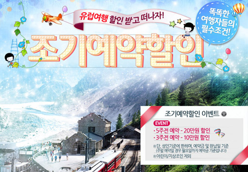 모두투어는 유럽 여행의 적기인 4, 5월에 여행 경비까지 할인 받을 수 있는 유럽 여행 조기예약 할인 상품을 선보인다. 출발일로부터 5주 전에 예약하고 예약금을 입금하면 1인당 20만원, 3주 전에는 10만원 할인이 가능하다.(단, 어린이나 항공권 소지자의 현지 관광 합류시는 적용이 불가능하다.)