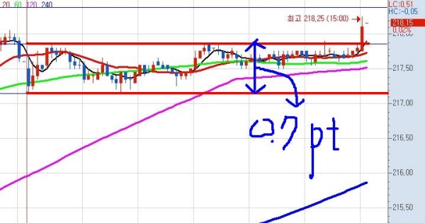 9일 만기일 2일을 남기고 포지션 구축에 들어간 세력들의 공방은 하루종일 0.7pt에서 가두어 버리는 흐름으로 나타나 투자자들의 투자심리를 더욱 애타게 만들었다. 주식시장 마감이후 눈치를 보지 않는 세력들이 이 기회를 이용해 장을 끌어올리는 듯 하였으나 저항선인 218.25에 부딧쳐 결국 반짝 상승으로 끝나는 모습을 보였다.