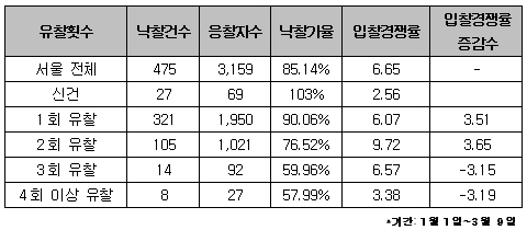 11일 경매정보업체 디지털태인에 따르면 올 들어(1월 1일~3월 9일) 서울지역 아파트 낙찰물건(475건)을 대상으로 유찰횟수에 따른 입찰경쟁률을 분석한 결과 2회 유찰된 물건의 입찰경쟁률이 9.72명으로 가장 높았다.