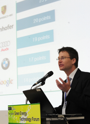 ▲ 15일 서울 광진구 화양동 건국대 새천년관 우곡국제회의장에서 열린 건국대-프라운호퍼 차세대태양전지연구소주최 제1회 국제 그린에너지 포럼에서 독일 프라운호퍼연구소의 토마스 슈레글 수석 과학자(전략기획실장) 태양광 등 신재생에너지의 세계적 연구개발 동향과 산업화 전망을 발표하고 있다. |