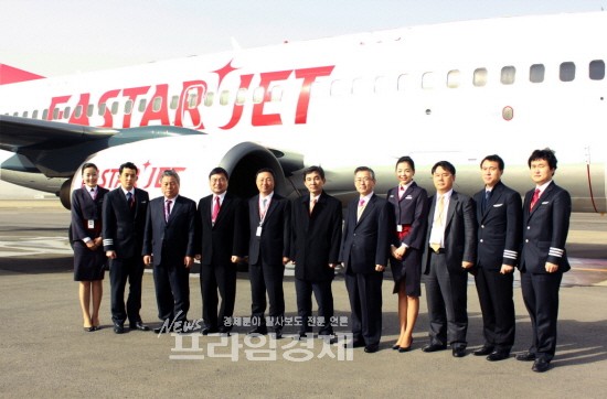 | <사진= 이스타항공그룹 이상직 회장(왼쪽에서 네번째)과 임직원들이 16일 오전 6호기 도입 및 안전기원식을 가졌다> | ||