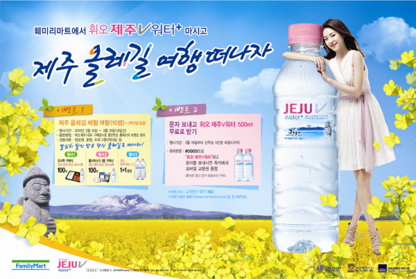 훼미리마트에서 한라산 화산암반 프리미엄 생수인‘제주V워터’2종을 구매하고 영수증 속 행운번호를 홈페이지에 응모하면 추첨을 통해 10쌍(1인 2매)에게 제주 올레길 패키지 여행상품권(항공권, 숙박권, 제주 올레길 프로그램)을 증정한다.