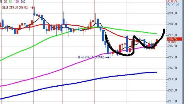 상승시 코스피지수로 1660을 넘는지가 중요하며 선물지수는 217.50을 지지선으로 만드는가가 중요하다. 하락할 경우 216이 지지되는지를 살펴야 되며 붕괴시 214까지 갈 수 있는 위치에 있으므로 유의해야 할 것이다.