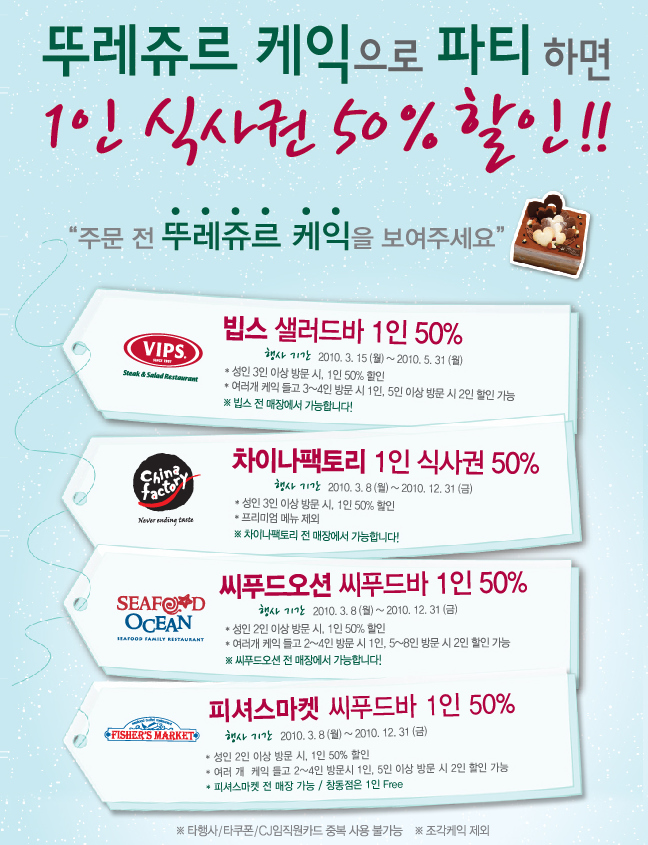 씨푸드 전문 패밀리레스토랑 씨푸드오션과 피셔스마켓은 12월 말까지 뚜레쥬르 케익을 가지고 성인 2인 이상이 생일 파티를 할 경우, 생일자 1인에 한해 씨푸드바 50%를 할인해 준다. 2개 이상의 케익을 들고 5인 이상이 방문하면 2인까지 할인 혜택을 제공한다.