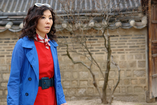 화려한 빨간색 코트에 몸에 딱 붙는 파란색 원피스를 매치한 후 얼굴에는 진하면서도 알록달록한 메이크업을 덧 입혔다. 그리고 뽀글 파마머리 위에는 선글라스를 올린 과감한 모습으로 등장한 것. 이제까지 세련된 이미지로 인식돼 왔던 이미숙이 현란한 원색으로 무장, 다소 천박하지만 도발적인 느낌을 주는 팜므파탈의 이미지를 선보인 셈이다. 촬영 당일 이미숙의 모습에 제작진은 "역시 천의 얼굴을 가진 연기자"라고 극찬을 보냈다는 후문이다.
