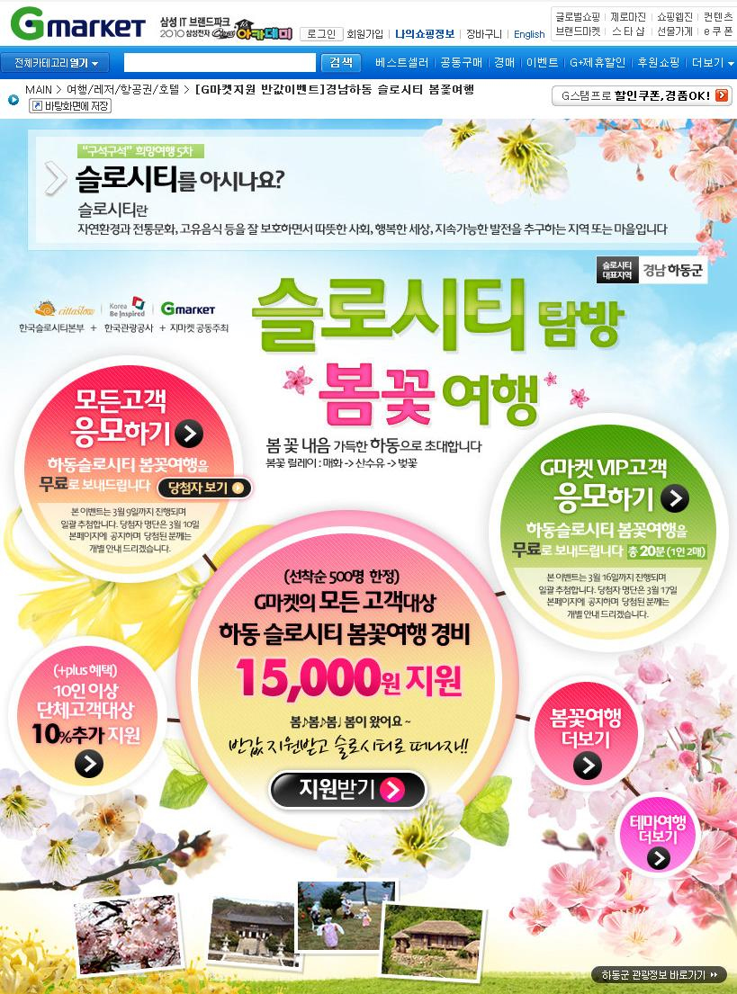 옥션숙박(http://accommodations.auction.co.kr)에서는 남원, 진해 등 전국 유명지의 당일치기 봄 꽃 여행을 즐길 수 있으며 3만원 대부터 이용할 수 있다. ‘섬진강 매화꽃 여행’(4만 7000원)에서는 광양 매화마을과 섬진강 자락을 따라 펼쳐져 있는 매화꽃은 물론 홍싸리 여사의 매실 장독대, 남원재래시장 방문 등 다채로운 이벤트를 즐길 수도 있다.