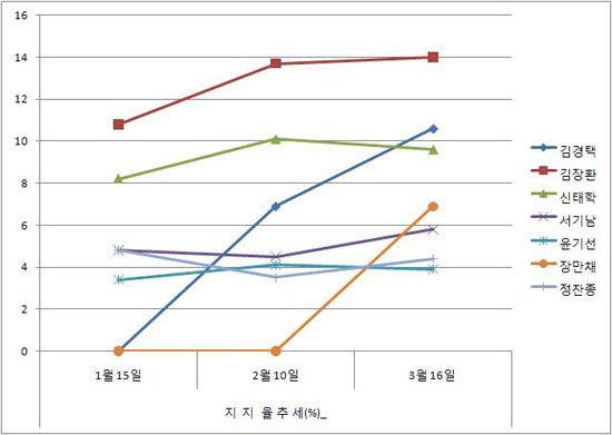 이어 김경택 동아인재대 총장이 10.6%, 신태학 전 순천교육장 9.6%, 장만채 전 순천대 총장 6.9%, 서기남 전 여수교육장 5.8%, 정찬종 전 무안교육장 4.4%, 윤기선 전 전남교육연수원장이 3.9%순으로 나타났다.