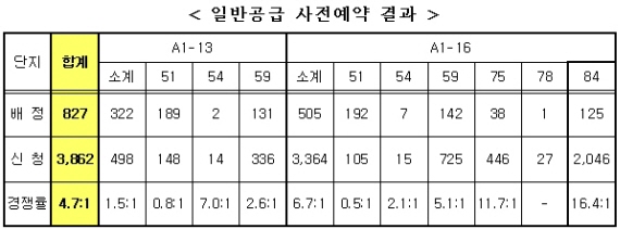 국토부에 따르면 이번 일반공급 사전예약 중 A1-16블럭 84㎡(전용면적)는 125가구 배정에 2046명이 신청해 가장 높은 경쟁률(16.4대1)을 보였다.
