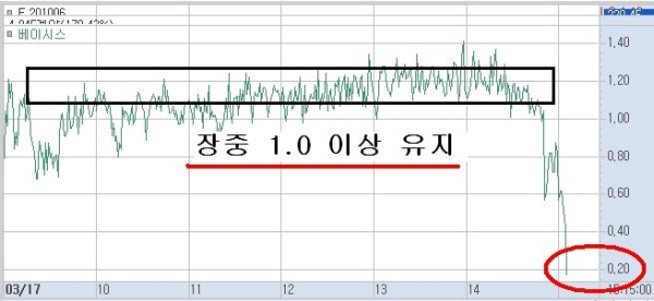 17일 상승의 신호탄이었던 전일 베이시스의 상승과 반대로 17일은 마감 베이시스가 0.17로 마감하였다. 전일 마감하였던 1.40 과는 판이하게 다른 수치로 볼 수 있다. 그러면, 베이시스를 내린 18일 증시가 어떻게 출발할까 궁금하게 만드는 요소라 볼 수 있다.