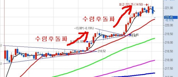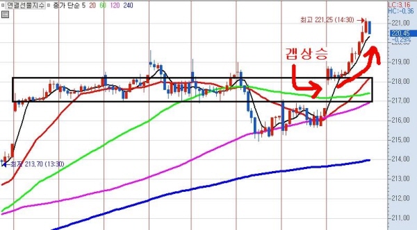 갭 으로 출발한 증시는 만기주 5거래일 동안 횡보를 했던 저항선인 217.20~218.30을 가볍게 뛰어넘어 출발하여 한 동안 횡보를 보이는 듯 한 모습을 보였으나 12시 20분 이후 무섭게 올라 결국 최고점인 221.25를 기록하고 소폭 내린 220.45로 끝났다. 1월의 고점이 266.55인 점을 고려할 때 전고점 돌파는 무난할 것으로 보인다.