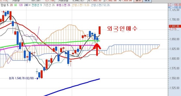 17일 코스피지수는 외국인의 매수세에 힘입어 전날보다 34.85pt오른 1682.86을 기록했다. 외국인은 현선물 1조이상을 순매수하며 증시 견인에 앞장섰는데 그 요인으로는 외환시장에서의 안정적인 분위기와 저금리 지속여부 등에 기인한 것으로 보인다.