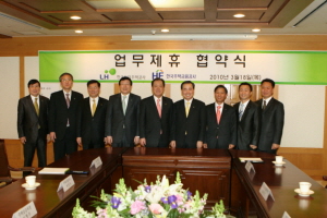 | <주택금융공사(HF) 임주재 사장과 토지주택공사(LH) 이지송 사장이 18일 오전 LH 사옥에서 업무제휴 협약식 기념촬영을 하고 있다./ 주택금융공사> |
