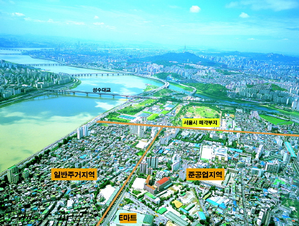 | 서울시의 뚝섬부지 고가 분양 여파로 투기장으로 변해버린 성수동 일대 항공사진. 특히 왼쪽의 일반주거지역의 투기가 심하다 | ||