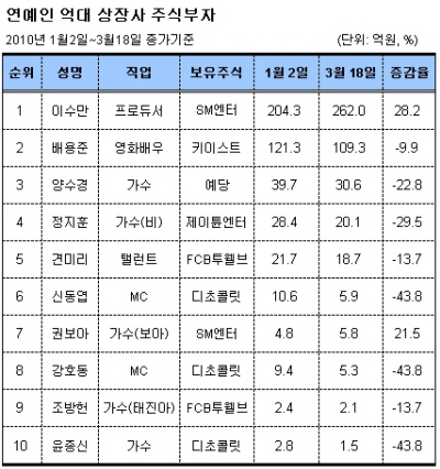 19일 재벌닷컴에 따르면, 유명 연예인이 보유한 상장사 주식지분 가치를 평가한 결과(18일 종가 기준) 1억원 이상을 기록한 유명 연예인은 총 10명이다.