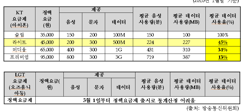 국회 문화체육관광방송통신위원회 한선교의원(한나라당, 경기 용인 수지)이 방송통신위원회로부터 제출받은 자료에 따르면, 국내 스마트폰 사용자들은 자신이 가입한 정액요금제의 데이터 용량의 절반 가량을 사용하지 못하는 것으로 분석됐으며, 특히 비싼 요금제일수록 잔여 데이터 분량이 많은 것으로 드러났다.