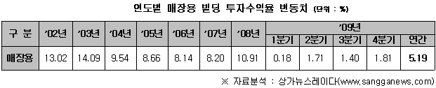 상가뉴스레이다에 따르면 지난해 4분기 매장용 빌딩의 투자수익율은 2009년 중 가장 높은 수치를 기록했는데 이는 임대수입 증가, 자산가치 상승, 영업경비 감소 등의 원인으로 분석된다. 반면 매장용 빌딩의 2009년 총 연간 수익율은 5.19%로 2008년에 비해 크게 떨어진 것으로 나타났는데 경기위축에 따른 임차수요 둔화와 공실 증가 등이 하락세에 작용한 것으로 판단된다.