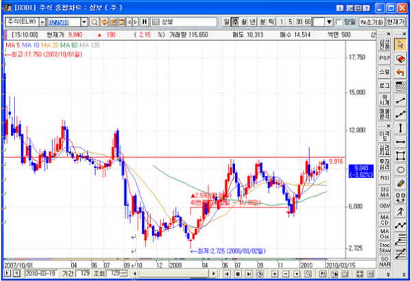 기술적 분석으로 본다면,"60일선 돌파와 안착이 이루어지고 있으며,2008년 이후 견고한 저항선 작용을 하는 10,000원 돌파하면서 시세가 분출될 가능성이 있다"라고 분석했다.