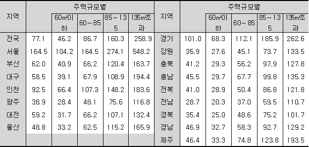 하지만 135㎡를 초과하는 대형주택은 모든 지역에서 100을 넘었고, 국민주택규모(85㎡) 초과 주택 역시 광주를 제외한 모든 광역시에서 100을 웃돌아 중대형 주택의 구입은 여전히 부담이 큰 것으로 분석됐다.