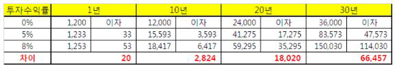 자산을 지키는 것에 만족하지 않고 한 발 더 나아기 위해서는 필수적으로 투자수익률을 높여 복리 효과를 극대화시켜야 한다. 투자수익률이 5%일 때와 8%일 때의 이자차이가 1년 후에는 20만원밖에 나지 않지만 10년 후에는 2824만원, 20년 후에는 1억8020만원 그리고 30년 후에는 2.4배인 6억6457만원이나 차이가 난다. 투자를 통해 최소한 물가상승률보다 높은 자산을 형성해 나간다면 오랜 시간이 지난 후에 더 많은 혜택을 누릴 수 있다는 말이다. 금융시장이 선진화 될수록 미국이나 일본처럼 금리가 점점 낮아질 것이라는 사실은 자명한 일이다. 이제 투자는 선택이 아닌 필수의 시대로 접어들고 있는 것이다.