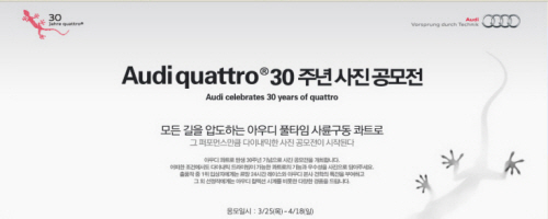 [프라임경제]아우디코리아는 콰트로(quattro) 탄생 30주년을 맞아 ‘아우디 콰트로 30주년 사진 공모전’을 다음달 18일까지 개최한다고 24일 밝혔다.